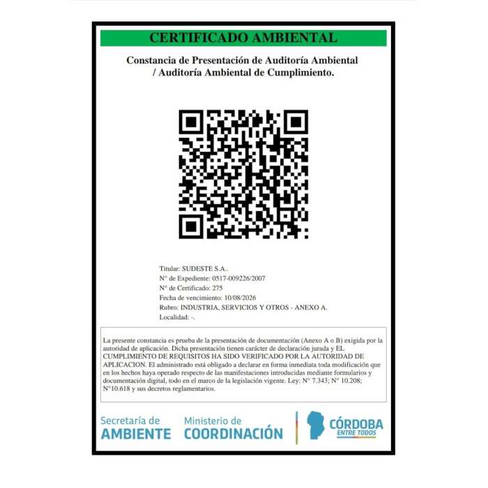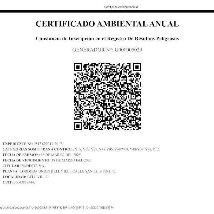 Como generadores de residuos peligrosos, contamos con el certificado ambiental de la provincia de Córdoba que acredita la presencia y aprobación de un sistema de manipulación, transporte, tratamiento y disposición final de residuos peligrosos.